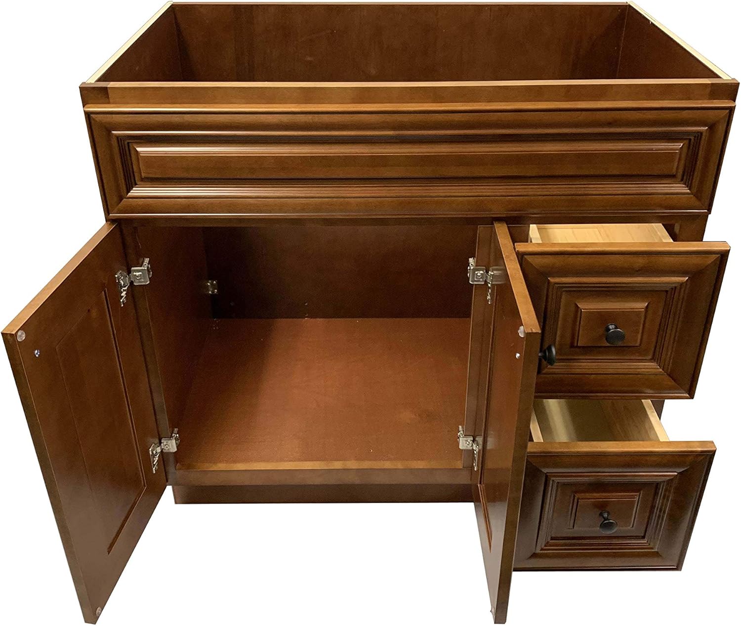 Maple Walnut wood species : Russian birch Frame: 3/4" Solid birch Door : solid birch door frame and veneered door panel Door Style: Walnut Overlay: full overlay Construction 1/2 " plywood with birch Veneer Hinges : Frameless Cabinet Hinges Drawer Box 5/8" rubber wood dovetail , natural finish Drawer Glide : under mount soft close glide Door Finish : Maple Walnut Box Finish : interior and exterior match color of face front